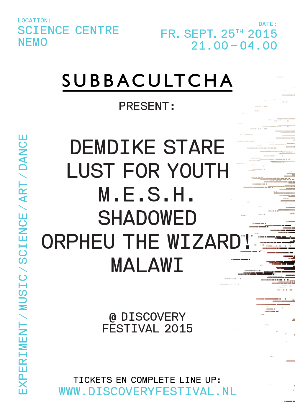 We’ve teamed up Amsterdam-based science, art and technology fest Discovery Festival to curate a cutting-edge musical accompaniment to the vast experimental adventure on show at the Amsterdam Science Center NEMO on 25 September. Headlining the musical program is a truly rare live audio visual performance by Manchester-based duo Demdike Stare. They’ll be accompanied by Posh Isolation/Sacred Bones synthpop maestros Lust For Youth, Janus/PAN noisenik M.E.S.H. and a unique live analogue set from Fog Mountain locals Lemontrip and HOEK as Shadowed. Capping off the night are two of the city’s finest selectors, Red Light Radio head honcho Orpheu The Wizard! and DJ-collective Malawi. The event on the 25th is free for Subbacultcha members before midnight, so show up (with an open mind) early.
