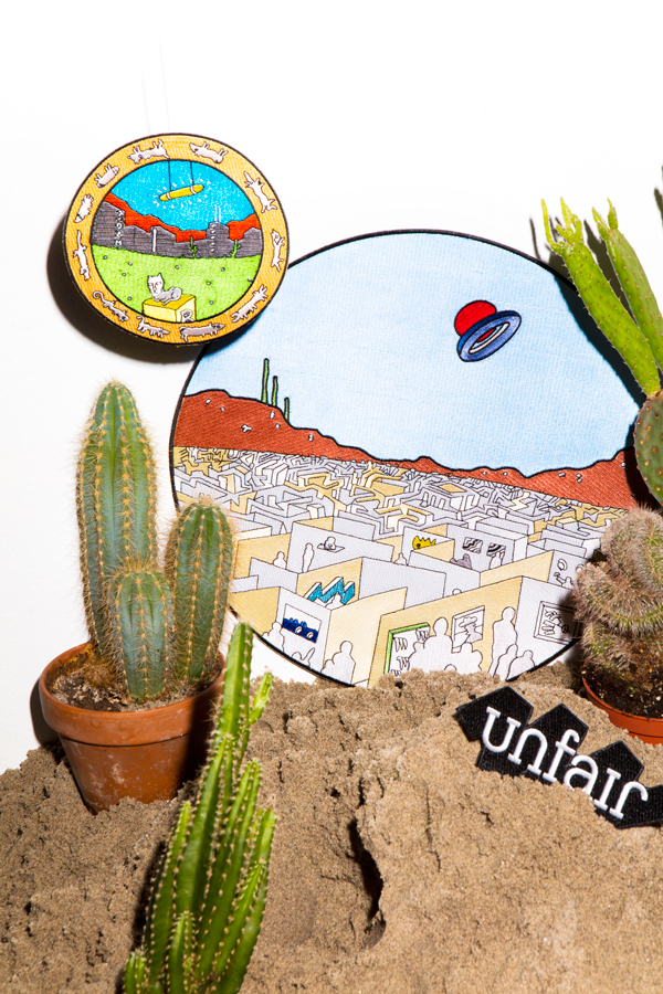 If most art collectives are built with blood, sweat and tears, Unfair adds a lot of guts and heart to that winning combination. They’re our best buds and we’re in awe of them. In anticipation of their third art fair, happening at Zuiveringshal West, Amsterdam from 30 March till 03 April 2016, they invited four artists – Kim David Bots, Ingmar König, Jan Hoek and Boris de Beijer – to design patches, that is iron-on, 100% embroidered, art patches. It’s a project emblematic of their cool, casual and effective way of working with artists. They also got up-and-coming fashion designer Sophie Hardeman, with her conceptual take on denim, and fashion photographer Valentina Vos on board. It’s an Unfair classic; cue artist and co-founder Peter van der Es.